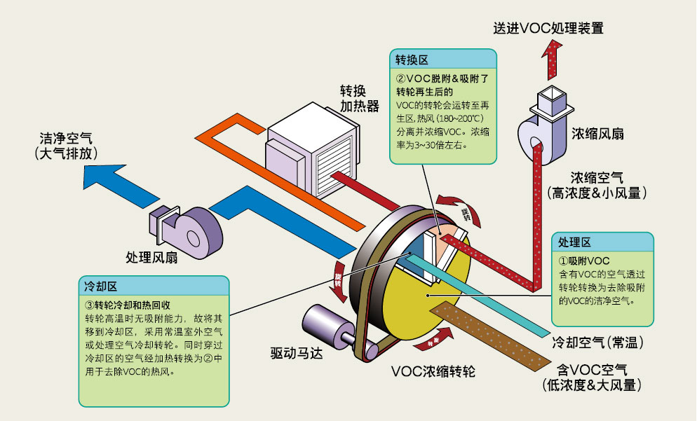 低浓度、高风量的有机废气流过浓缩转轮吸附区时,其中的挥发性有机物会被吸附下来。经过吸附净化后的气体(风量约占总量的90%)排放到空气中去。一小部分气体(风量约占总量的10%)被加热到脱附温度。浓缩转轮持续旋转到脱附区域,在此有机物从吸附剂上脱离到加热的少量气流中,从而转轮得到再生。而高浓度、低风量的浓缩VOCs气体最终被送入焚烧炉TO/RTO处理。再生后的沸石转轮进入冷却区,被冷却到常温后,再进入吸附区。